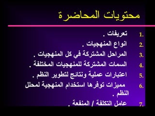 يتناول الوثيقة منهجيات تطوير النظم من حيث التعريفات وأنواع المنهجيات والمراحل المشتركة في كل منها. كما يوضح السمات المشتركة وأساليب معينة لتحليل وتصميم الأنظمة، بالإضافة إلى الاعتبارات العملية لتطوير الأنظمة. واستعرض الوثيقة أيضًا مميزات استخدام المنهجيات وتأثيرها على فعالية عملية تطوير الأنظمة.