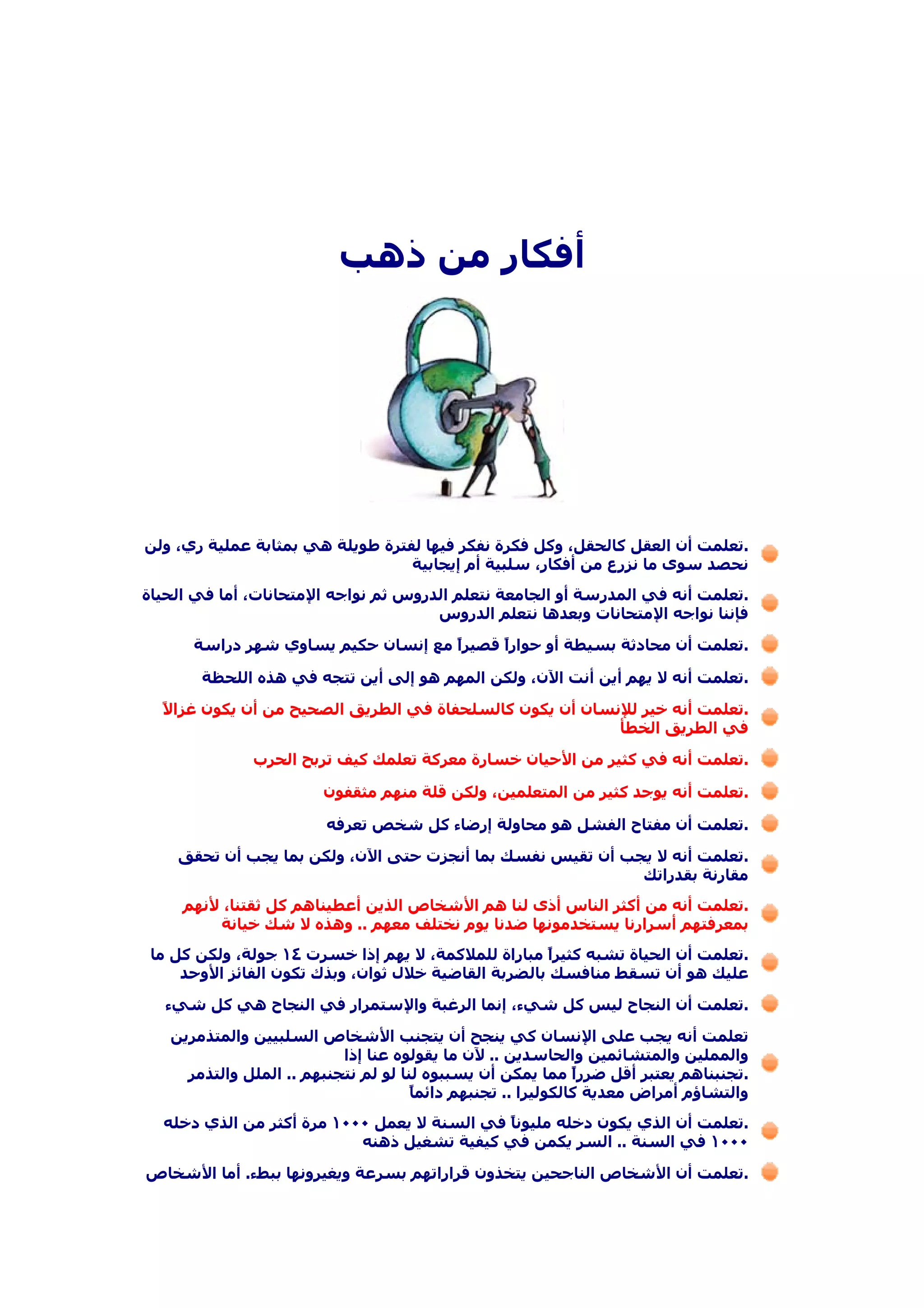 الوثيقة تناقش الدروس الحياتية التي تم تعلمها، مثل أهمية الفشل كجزء من النجاح، وضرورة تعلم الأشخاص من تجاربهم. تشير أيضًا إلى أن الأشخاص الناجحين يأخذون وقتهم في اتخاذ القرارات بينما يتخذ الفاشلون قرارات سريعة. في النهاية، تحتوي الوثيقة على نصائح حول كيفية التقدم في الحياة وتجنب السلبية.