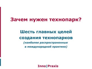Технопарки создаются для содействия сотрудничеству науки и бизнеса, обеспечения экономического роста и коммерциализации научных разработок. Их эффективность зависит от наличия действующих организаций, готовых к сотрудничеству, и от условий для ведения бизнеса. Важно заранее анализировать возможные проблемы и противоречия между заинтересованными сторонами при создании технопарка.