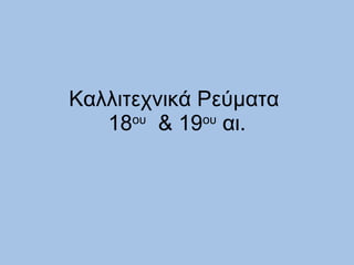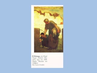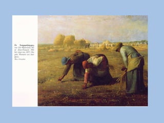 γ. Ρεαλισμός β΄μισό του 19 ου αι. Κύρια γνωρίσματα: Προσπάθεια πιστής απόδοσης της πραγματικότητας Ενδιαφέρον για την καθημερινότητα των απλών ανθρώπων Ενδιαφέρον για το καθημερινό, όχι το ωραίο