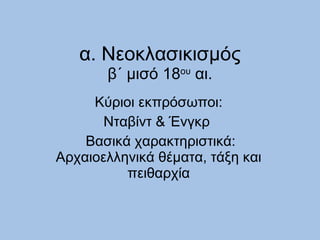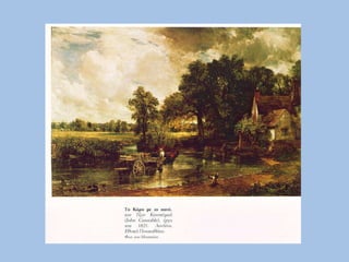 β. Ρομαντισμός α΄μισό του 19 ου αι. Κύρια γνωρίσματα: κυριαρχία συναισθήματος αγάπη για το μυστηριώδες στροφή προς τη φύση ενδιαφέρον για πατρίδα & θρησκεία προτεραιότητα του χρώματος έναντι της μορφής