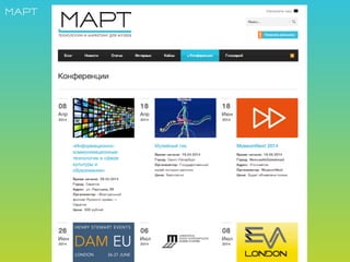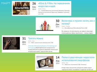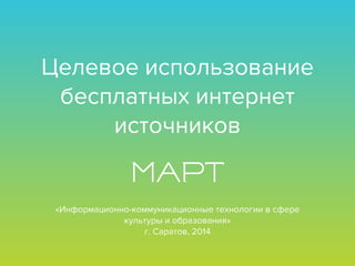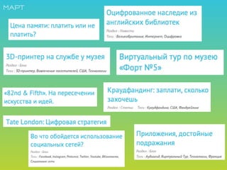 Документ представляет собой обзор бесплатных интернет-ресурсов, связанных с информационно-коммуникационными технологиями в области культуры и образования, акцентируя внимание на музеях и образовательных мероприятиях. Он включает в себя ссылки на российские и зарубежные электронные библиотеки, платформы для музейных выставок, а также ресурсы для обучения и внедрения новых технологий в музейное дело. Также упоминаются инициативы по созданию виртуальных экспозиций и активному использованию социальных сетей для продвижения музеев.