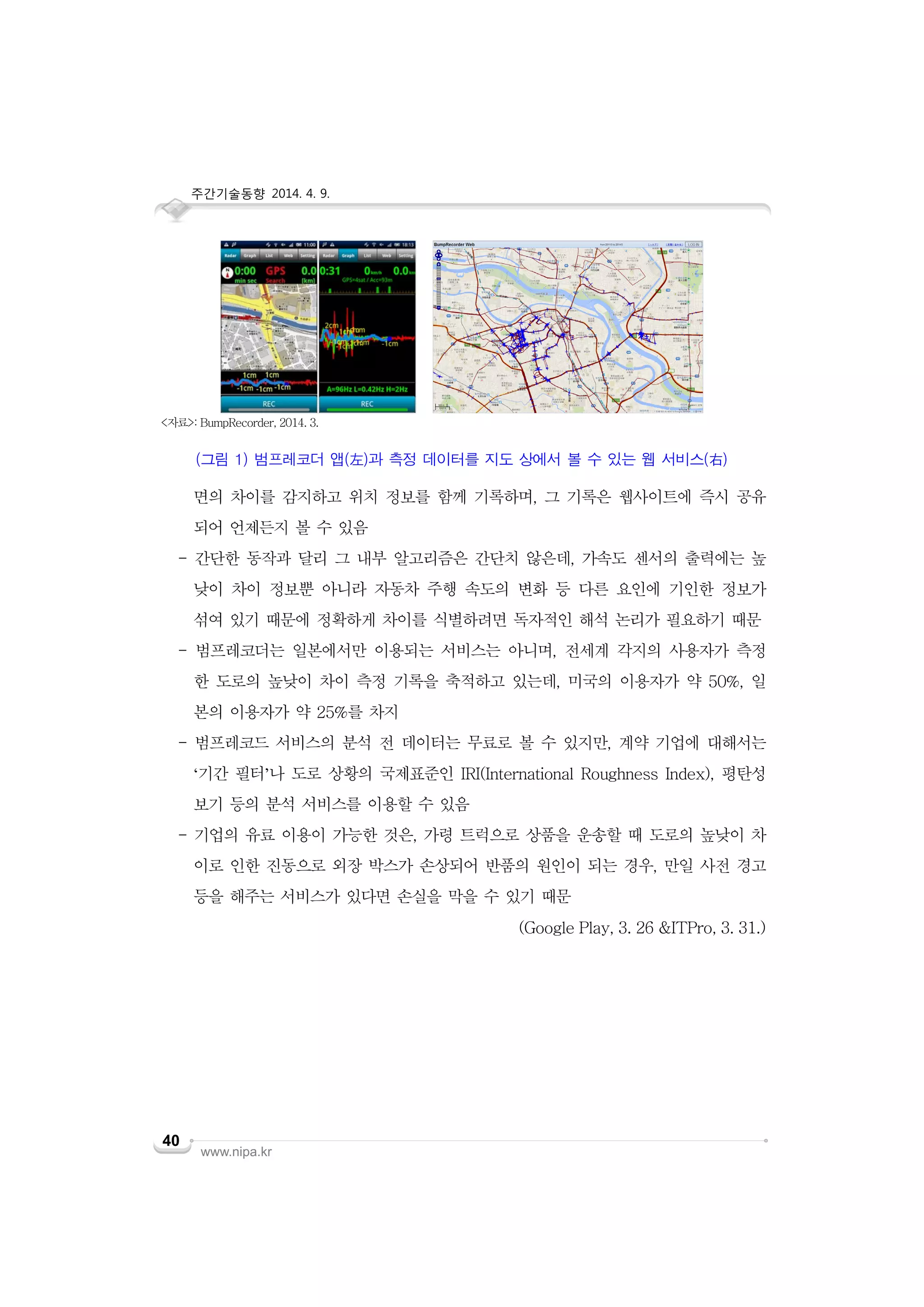 (그림 1) 범프레코더 앱(左)과 측정 데이터를 지도 상에서 볼 수 있는 웹 서비스(右)
