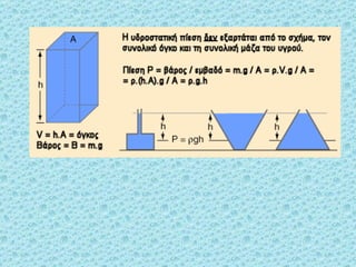* Ηπίεση σε ένα βάθος από την ελεύθερη επιφάνεια ενός ακίνητου υγρού είναι το αποτέλεσμα του βάρους του υγρού που ασκείται στην μονάδα επιφάνειας σε αυτό το βάθος συν την πίεση που ασκείται στο υγρό στην ελεύθερη επιφάνειά του. * Η υδροστατική πίεση είναι ανάλογη της πυκνότητας του υγρού, της επιτάχυνσης της βαρύτητας και του βάθους από την επιφάνεια του υγρού P=d.g.h * Η πίεση δεν είναι διάνυσμα παρόλο που στα σχέδια την δείχνουμε με βέλος. Το βέλος δείχνει την κατεύθυνση της δύναμης που ασκείται κάθετα στην επιφάνεια.