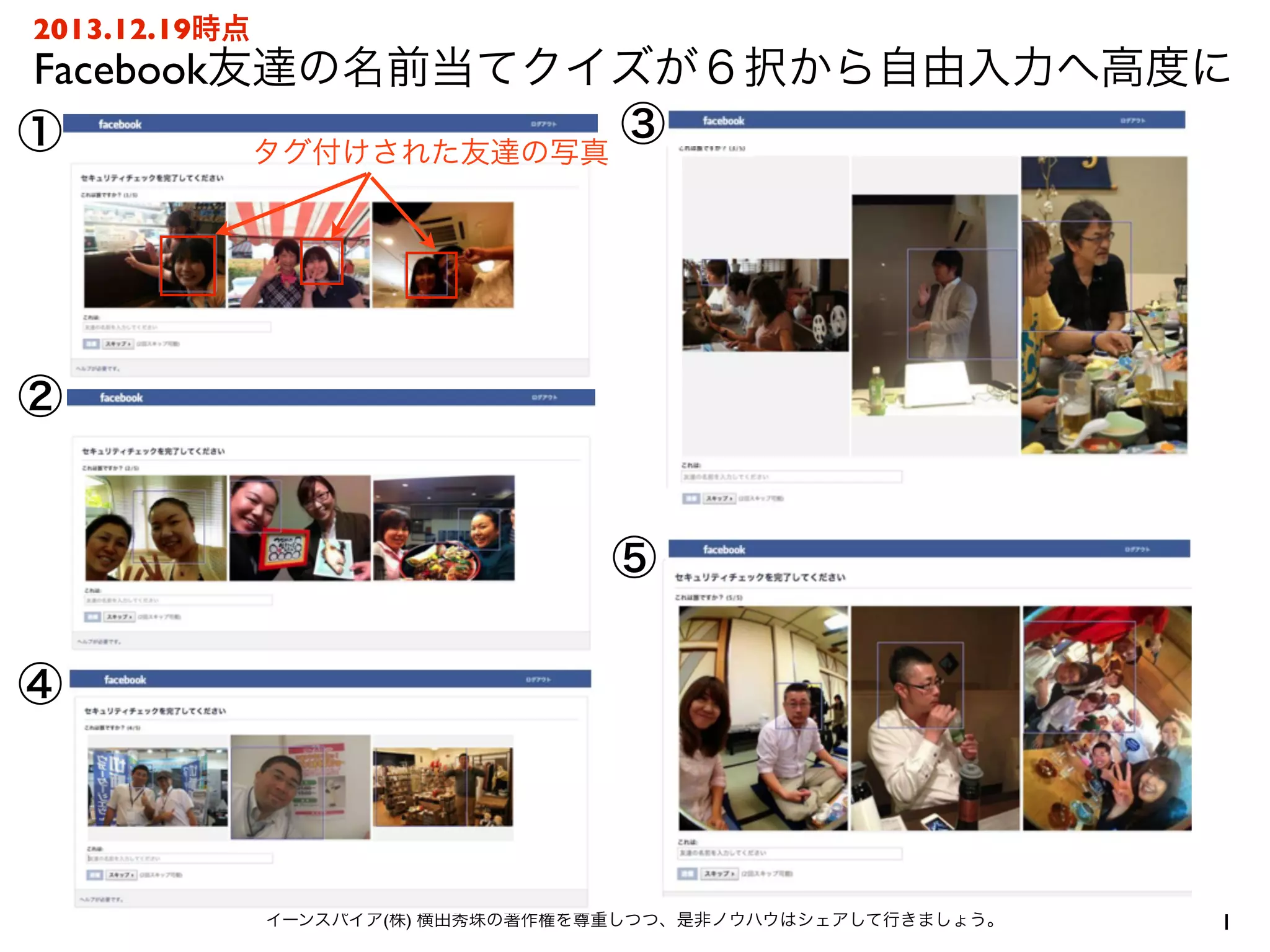 1イーンスパイア(株) 横田秀珠の著作権を尊重しつつ、是非ノウハウはシェアして行きましょう。 Facebook友達の名前当てクイズが6択から自由入力へ高度に ① ② ③ ⑤ ④ タグ付けされた友達の写真 2013.12.19時点