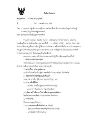 พฤศจิกายน 2556 เรื่อง การอบรมเชิงปฏิบัติการการเตรียมความพร้อมเพื่อเข้ารับการประเมินเป็นศูนย์การเรียนรู้ ตามหลักปรัชญาของเศรษฐกิจพอเพียง เรียน ผู้อํานวยการโรงเรียนทุ่งยาวผดุงศิษย์ ข้าพเจ้านางพรพนา สมัยรัฐ ตําแหน่ง ครูวิทยฐานะชํานาญการพิเศษ กลุ่มสาระ การเรียนรู้วิทยาศาสตร์ ร่วมกิจกรรมตามคําสั่งที่ ........../2556 ลงวันที่ ตุลาคม 2556 เรื่อง โครงการพัฒนาครู เพื่ออบรมเชิงปฏิบัติการการเตรียมความพร้อมเพื่อเข้ารับการประเมินเป็นศูนย์การ เรียนรู้ ตามหลักปรัชญาของเศรษฐกิจพอเพียง ระหว่างวันที่ 30-31ตุลาคม 2556 ณ ห้องเกียรติยศ โรงเรียนทุ่งยาวผดุงศิษย์ อําเภอปะเหลียน จังหวัดตรัง ขอสรุปรายงานผลการเข้าร่วมประชุมอบรมเชิงปฏิบัติการดังรายละเอียดต่อไปนี้ 1. หัวข้อการเข้าร่วมกิจกรรม โครงการพัฒนาครู เพื่ออบรมเชิงปฏิบัติการการเตรียมความพร้อมเพื่อเข้ารับการประเมิน เป็นศูนย์การเรียนรู้ ตามหลักปรัชญาของเศรษฐกิจพอเพียง 2. สถานที่ในการประชุมกิจกรรม ณ ห้องเกียรติยศโรงเรียนทุ่งยาวผดุงศิษย์ อําเภอปะเหลียน จังหวัดตรัง 3. วิทยากรในการประชุมอบรมสัมมนา นายสาคร เย่าเฉื้อง ผู้อํานวยการโรงเรียนรัษฎา นาย 4. ประธานในพิธีเปิด - นายสาคร เย่าเฉื้อง ผู้อํานวยการโรงเรียนรัษฎา - นายสถาพร พันธุประดิษฐ์ ครูโรงเรียนรัษฎา 5. หน่วยงานที่รับผิดชอบในการจัดประชุมอบรม สัมมนา โรงเรียนทุ่งยาวผดุงศิษย์ อําเภอปะเหลียน จังหวัดตรัง 6. งบประมาณ ใช้งบประมาณจากโครงการ 7. การวางแผนการเข้าร่วมกิจกรรม (Plan) - ผู้อํานวยการนัดหมายคณะครูที่จะเข้าร่วมประชุม - เตรียมแผนการจัดการเรียนรู้