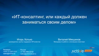 Документ описывает услуги IT-консалтинга, включая проектирование, внедрение и обслуживание ИТ-инфраструктуры в облаке. Он выделяет преимущества для клиентов, такие как высокое качество работы, гибкость и оптимизация затрат. Также рассматриваются способы использования услуг, включая ежемесячное обслуживание, проектирование отказоустойчивых решений и возможность реализации индивидуальных проектов.