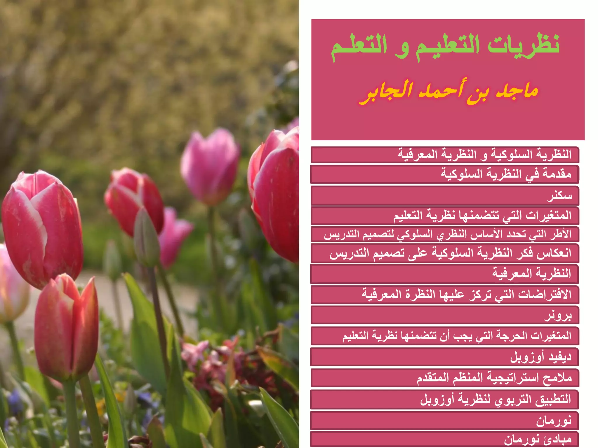 تناقش الوثيقة نظريتين رئيسيتين في التعليم: النظرية السلوكية والتي ترتكز على التعزيز والاستجابة، والنظرية المعرفية التي تركز على عمليات الإدراك والتحويل والتخزين للمعلومات. تتعرض الوثيقة لتفاصيل حول كيفية تطبيق هاتين النظريتين في تصميم التدريس واستراتيجيات التعليم، بما في ذلك دور المتغيرات الحاسمة في عملية التعلم. كما يتم ذكر مجموعة من العلماء الرائدين في هذا المجال مثل سكنر، أوزوبل، وبرونر.