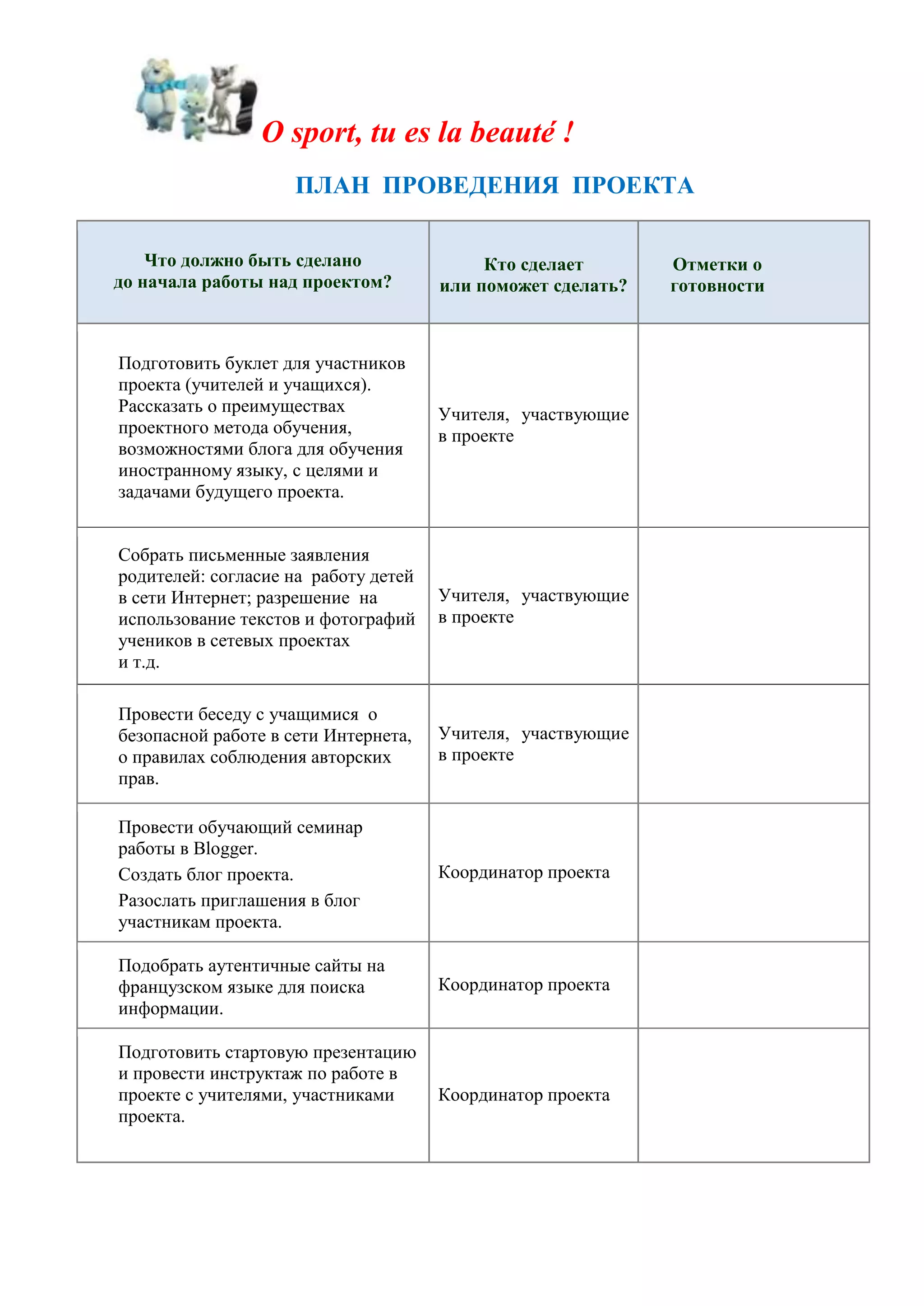 Документ описывает шаги и мероприятия, которые необходимо выполнить в рамках проекта 'o sport, tu es la beauté !'. Он включает этапы подготовки, реализации и завершения проекта, а также назначение ответственных участников и задачи, связанные с безопасной работой в интернете и использованием блог-платформ. В конце проекта планируется провести оценивание, рефлексию и вручение дипломов участникам.