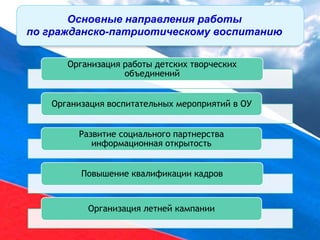 Документ описывает деятельность дома детского творчества «На реке Сестре» в 2013-2014 учебном году, сосредотачиваясь на патриотическом воспитании. Основные направления работы включают организацию творческих объединений, воспитательных мероприятий и повышение квалификации кадров. Приведены примеры мероприятий, таких как конкурс допризывной молодежи и акция «Мы – граждане России!», направленные на развитие гражданской активности среди молодежи.