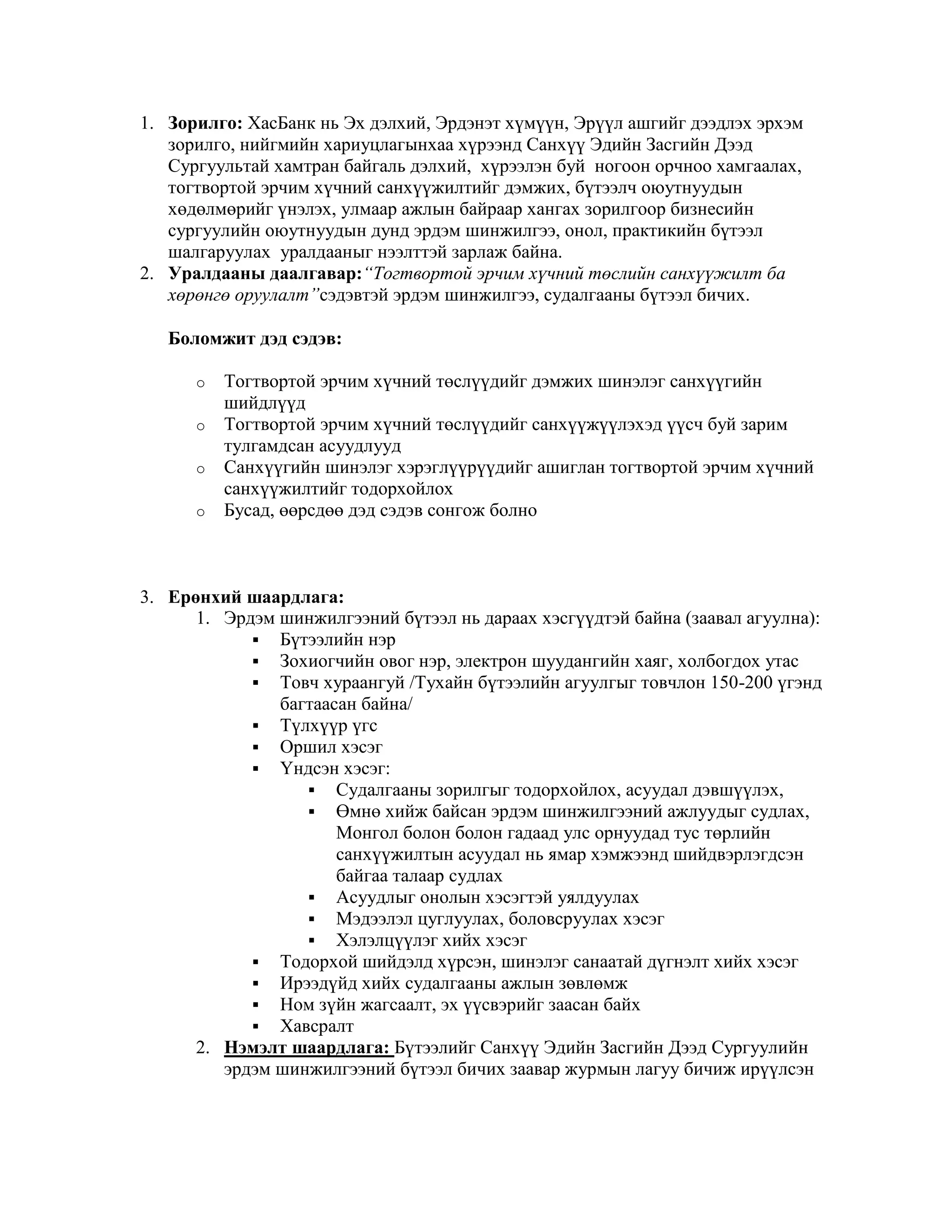 журмыг ХасБанкны цахим хуудас дээрх тус уралдааны зар дээрээс авч болно. 4. Бусад: Шалгаруулах үе шат болон материал хүлээн авах: Тус уралдаан нь 2 үе шаттай явагдана. Эхний шатанд оролцох бүтээлүүдийг сонгон шалгаруулах комисс урьдчилан шүүж , 2-р шатны шалгаруулалтанд оролцох баг/гишүүдтэй XасБанкнаас холбоо барьж мэдэгдэнэ. Хурал зохион байгуулах тов: 2014 оны 05-р сарын 16-ны өдөр 1-р шатанд оролцох бүтээл хүлээн авах хугацаа: 2014 оны 05-р сарын 09-ны өдрийг дуустал 1-р шатанд оролцох бүтээлийн хураангуйг авах хугацаа: 2014 оны 04-р сарын 18-ны өдрийг дуустал зөвхөн PDF, DOC, DOCX формат бүхий электрон хувийг regzedmaa.b@xacbank.mn цахим хаягаар хүлээн авна. Эхний шалгаруулалтад тэнцсэн оролцогчдыг 2014 оны 05-р сарын 16-ны өдөр хоѐрдугаар шатанд илтгэл тавиулж, шилдэг 3 бүтээлийг шалгаруулан урамшуулна. Шагналын сан: 1-р байр: 1,500,000 төгрөг 2-р байр: 1,000,000 төгрөг 3-р байр: 500.000 төгрөг Холбоо барих: Асууж тодруулах зүйлс байвал ХасБанкны 318185 /1332/ дугаарын утсаар эсвэл regzedmaa.b@xacbank.mn цахим хаягаар холбогдон лавлана уу. Жич: Энэхүү уралдаанд төгсөх ангийн оюутнуудыг өргөнөөр оролцохыг уриалж байна. СЭЗДС-ИЙН ЭРДЭМ ШИНЖИЛГЭЭНИЙ БҮТЭЭЛ БИЧИХ ЗААВАР ЖУРАМ Эрдэм шинжилгээний бүтээлд авсан эшлэлийн эх үүсвэрүүдийг бүтээл дотор болон ном зүйн жагсаалтад бичихдээ олон улсын APA загварыг ашиглана. Бүтээл нь хураангуй, түлхүүр үг, оршил, үндсэн хэсэг, дүгнэлт, зөвлөмж, ном зүйн жагсаалтыг оролцуулан А4 (210x297mm) хэмжээтэй 20 хуудсанд багтана. Бүтээл нь Windows /2000/XP/VISTA-ийн Microsoft Office программ дээр хийгдсэн, *.doc, *.docx, *.pdf өргөтгөлтэй байна Бүтээлийн ерөнхий гарчиг нь 14pt хэмжээтэй Bold, ТОМ ҮСГЭЭР, Дэд гарчгууд нь 12pt үсгийн хэмжээтэй Bold форматтай, Бичвэрийн үсгийн фонт –[Times New Roman, 12pt, мөр хоорондын зай 1, баруун зүүн талаасаа зэрэгцсэн байна] Бичвэр дунд мөр хооронд жагсаалтыг тэмдэглэхдээ (Paragraph->Bullets) цэгэн тэмдэг (•)-ийг сонгоно.