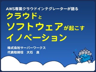 ソフトウェアのパワーでイノベーションを起こしたいと考えていらっしゃる企業の方に向けて、(1) イノベーションとは何か (2)イノベーションとはどのように起きるのか (3)なぜイノベーションにクラウドが有効なのか についてお話しさせて頂いた資料です。 私たちサーバーワークスも、クラウドとソフトウェアのパワーでイノベーションを起こそうとチャレンジしている企業の一つです。答えを求めるのでは無く「こういう考え方もあるんだ」という参考にして頂ければ幸いです!