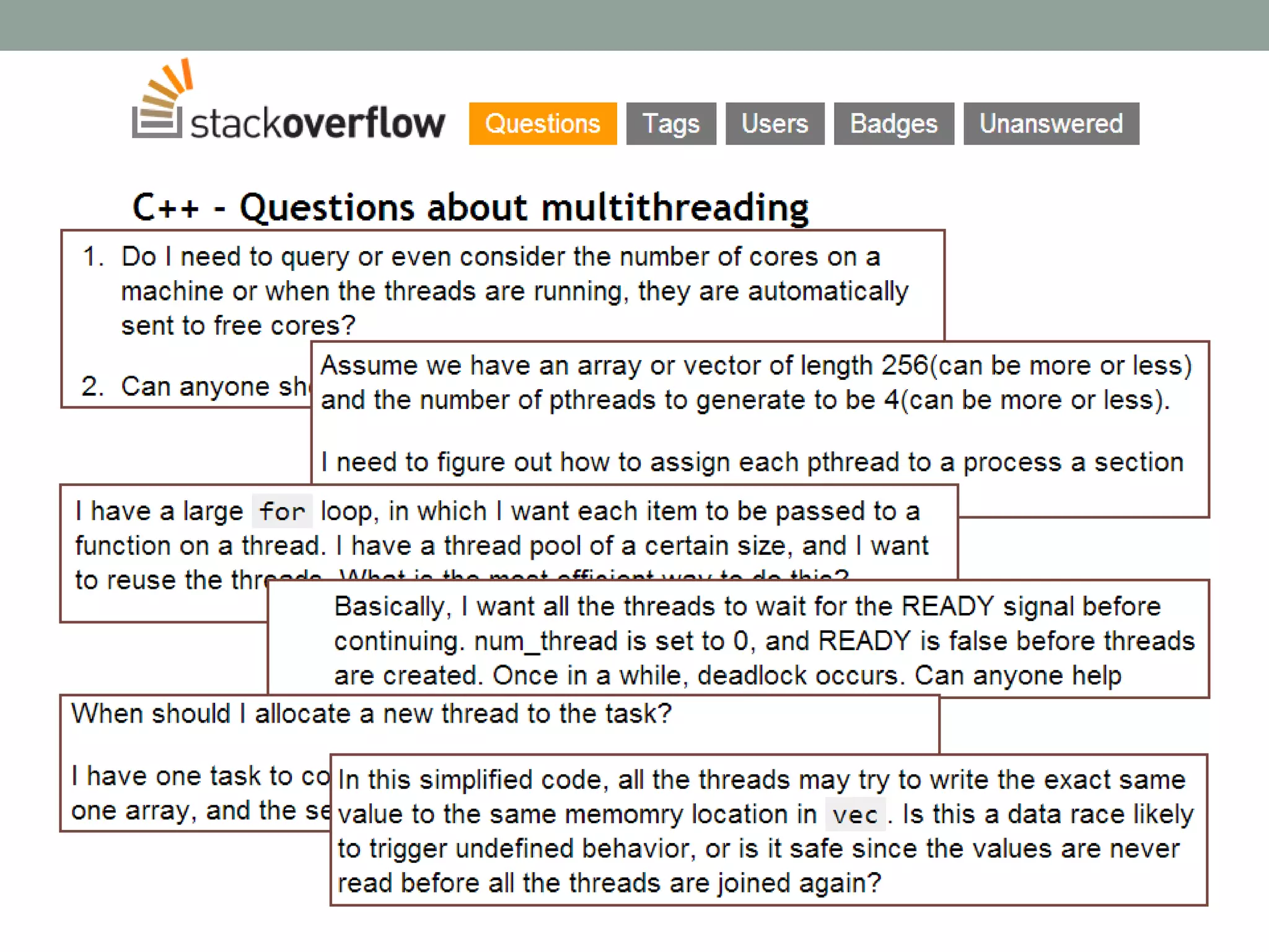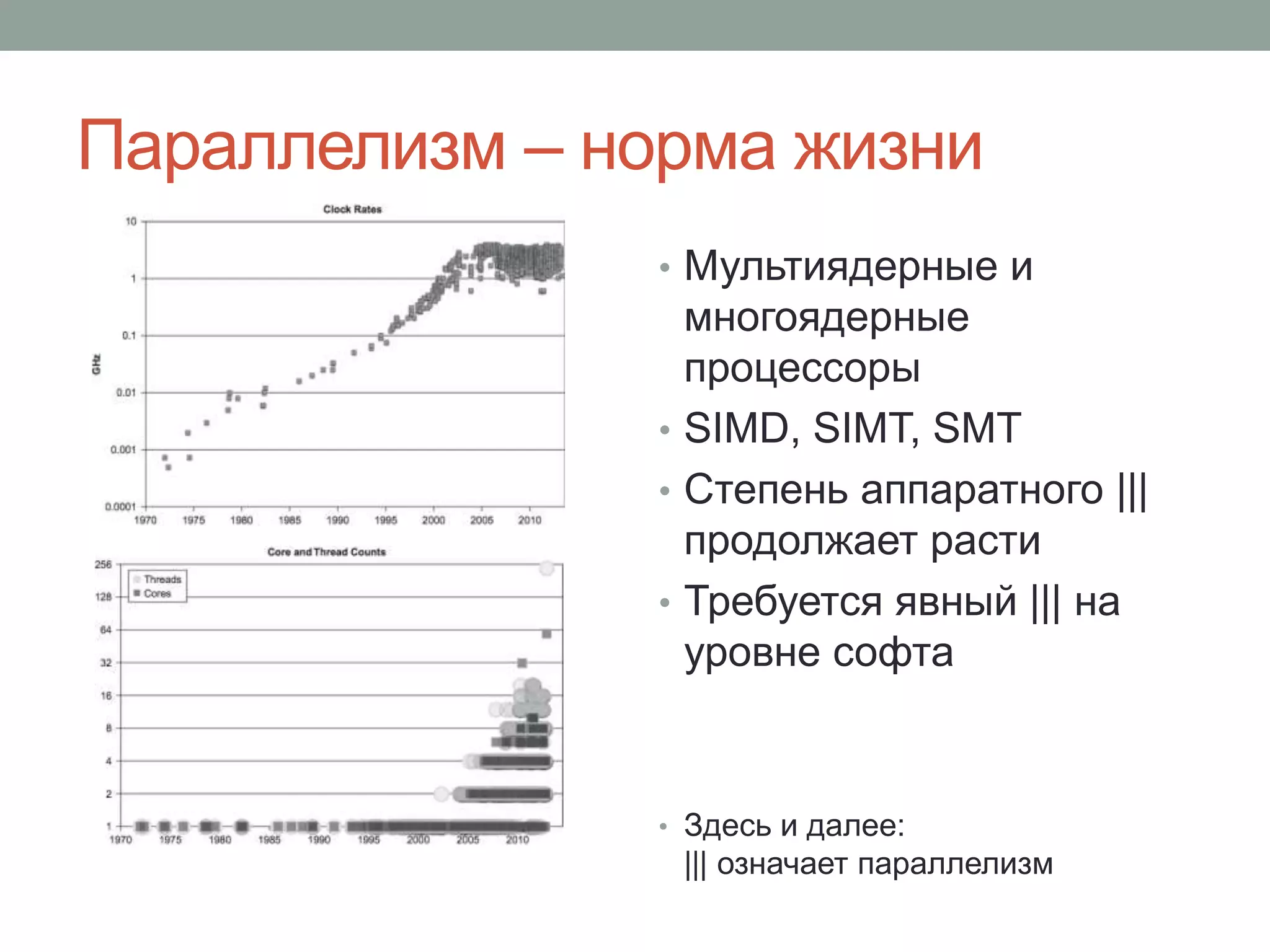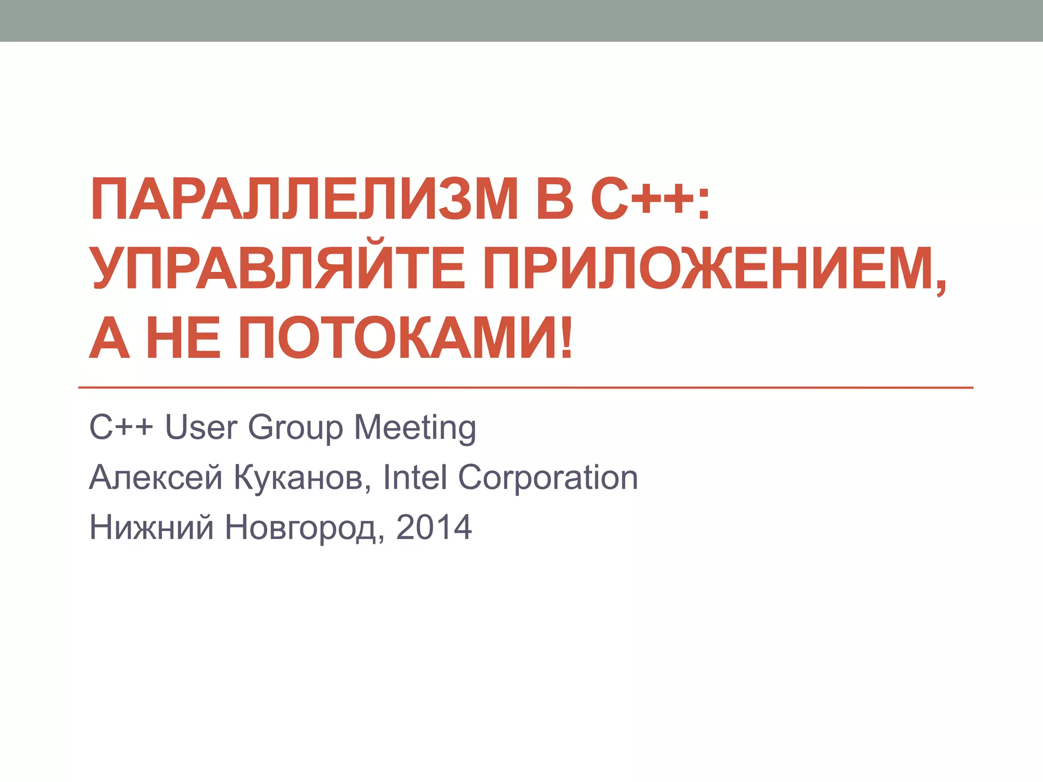 Документ обсуждает параллелизм в C++ и важные аспекты управления многопоточной программой, включая применение библиотек, таких как Intel TBB и Cilk Plus. Рассматриваются подходы к повышению эффективности параллельных вычислений через использование шаблонов и методов, таких как fork-join и редукция. Основное внимание уделяется необходимости экспертизы в разработке многопоточных программ и внедрению подходов к абстракции параллелизма на алгоритмическом уровне.
