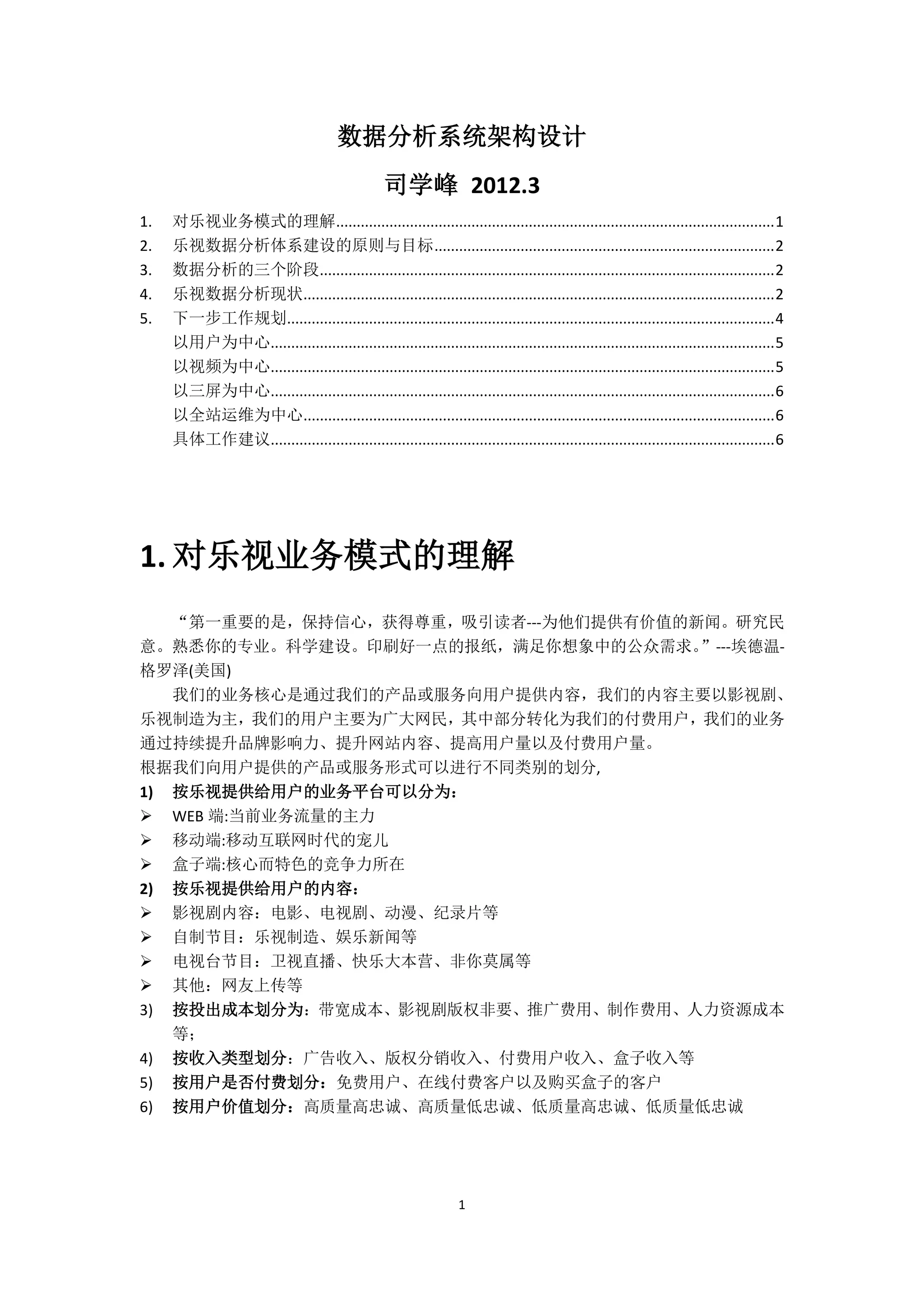 本文探讨乐视的数据分析体系设计,包括业务模式理解、数据分析原则与目标,以及三个分析阶段的详尽描述。数据部的现状和工作计划也被介绍,强调需加强与其他部门协作,以持续优化用户体验和视频价值。最后,阐明了未来工作重点在用户、视频及收益的深入分析上。