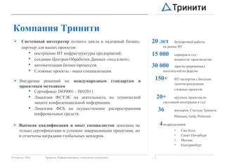 Компания 'Тринити' является системным интегратором с 20-летним опытом работы и предлагает широкий спектр услуг в области информационных технологий, включая построение IT-инфраструктуры и автоматизацию бизнес-процессов. Компания сертифицирована по международным стандартам и имеет множество успешных проектов в области системной интеграции и электронного документооборота. Основные компетенции включают виртуализацию, создание центров обработки данных и системы мониторинга, что позволяет гарантировать надежность и высокую производительность решений.