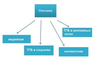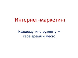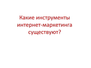 Документ описывает различные инструменты интернет-маркетинга, включая e-mail маркетинг, поисковый маркетинг, контент-маркетинг и социальные сети, а также их роль в профессиональной рекламе. Он детализирует, как планировать рекламные кампании с учетом целевой аудитории, бюджета и целей, а также анализирует важность таргетинга для повышения эффективности. Основное внимание уделяется трем типам рекламных кампаний: имиджевые, продуктовые и торговые, каждая из которых требует специфического подхода и показателей успеха.