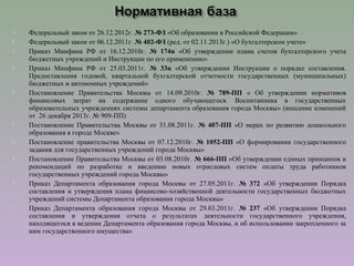 Документ содержит важные юридические положения и нормы, касающиеся образования и бухгалтерского учета в России, включая федеральные законы, постановления правительства Москвы и приказы различных министерств. Он освещает порядок формирования государственной отчетности образовательных учреждений, управления финансами, и процедуры реорганизации учреждений. Также подчеркивается роль родительской платы в системе образования и механизм компенсационных выплат для родителей.