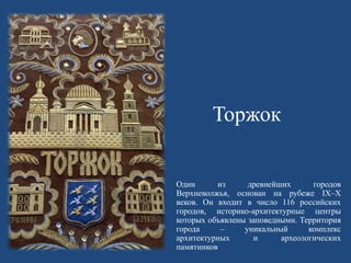 Торжок — один из древнейших городов Верхневолжья, основанный в IX-X веках и являющийся историко-архитектурным центром. Город славится уникальными архитектурными памятниками и традицией золотошвейного дела, связанного с А.С. Пушкиным. Гостиница Пожарского, известная в XIX веке, стала знаменитой благодаря авторству блюда, названного «пожарскими котлетами», впервые поданными Николаю I.