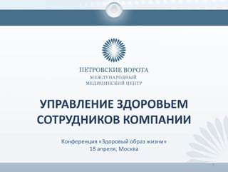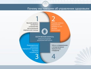 Документ представляет данные о статистике здоровья населения России, включая расходы на медицинские услуги и продолжительность жизни. В нем рассматриваются проблемы профессионального выгорания и здоровья офисных работников, а также новые подходы к корпоративному медицинскому обслуживанию. Подчеркивается важность профилактики и регулярных медицинских осмотров для сохранения здоровья сотрудников, а также экономическая выгода для компаний от таких инвестиций.