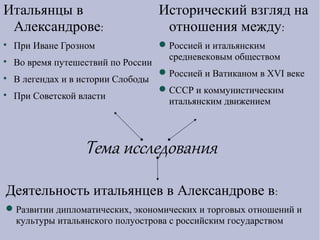 Документ представляет собой исследование о влиянии итальянцев на развитие Александрова с древних времен до советской эпохи, включая культурные, дипломатические и экономические аспекты. Основные темы исследования охватывают деятельность известных итальянцев в России, их медицинские достижения и вклад в архитектуру. В работе обобщены исторические данные, анекдоты и современное восприятие итальянской культуры в Александрове.