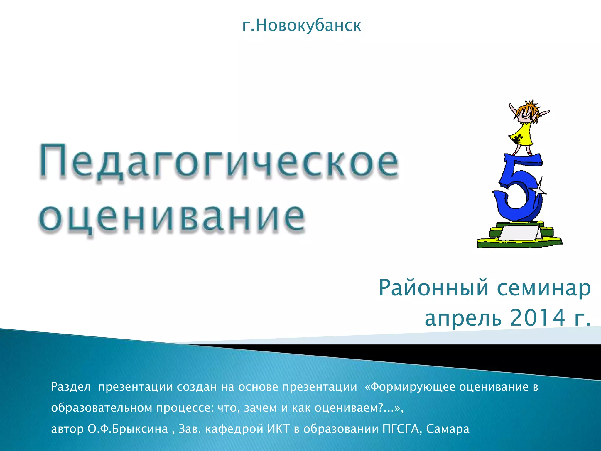 Документ представляет собой материал районного семинара, посвященного формирующему оцениванию в образовательном процессе. Он подчеркивает важность педагогического оценивания и его функции, а также проблемы, связанные с существующей системой оценивания, которая не учитывает индивидуальные достижения учащихся. В документе также описываются различные виды промежуточной аттестации и принципы системы оценивания в начальной школе.