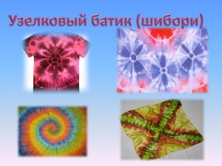 Проект ученицы 8 класса посвящен искусству батика, его истории, техникам и доступности для школьников. Цель проекта – воспитание эстетического чувства и освоение художественной росписи тканей. Работы включают различные виды батика и его применение в современной художественной практике.