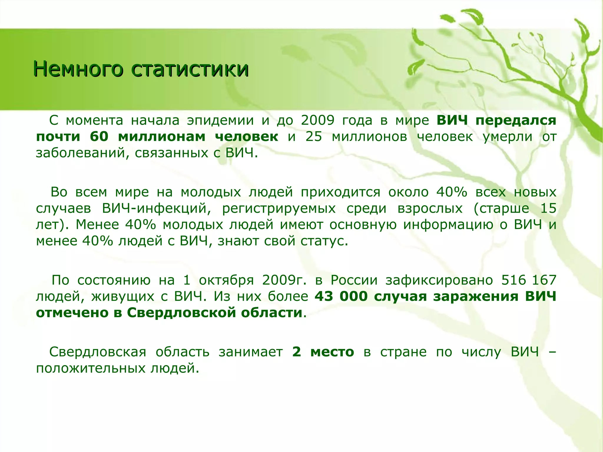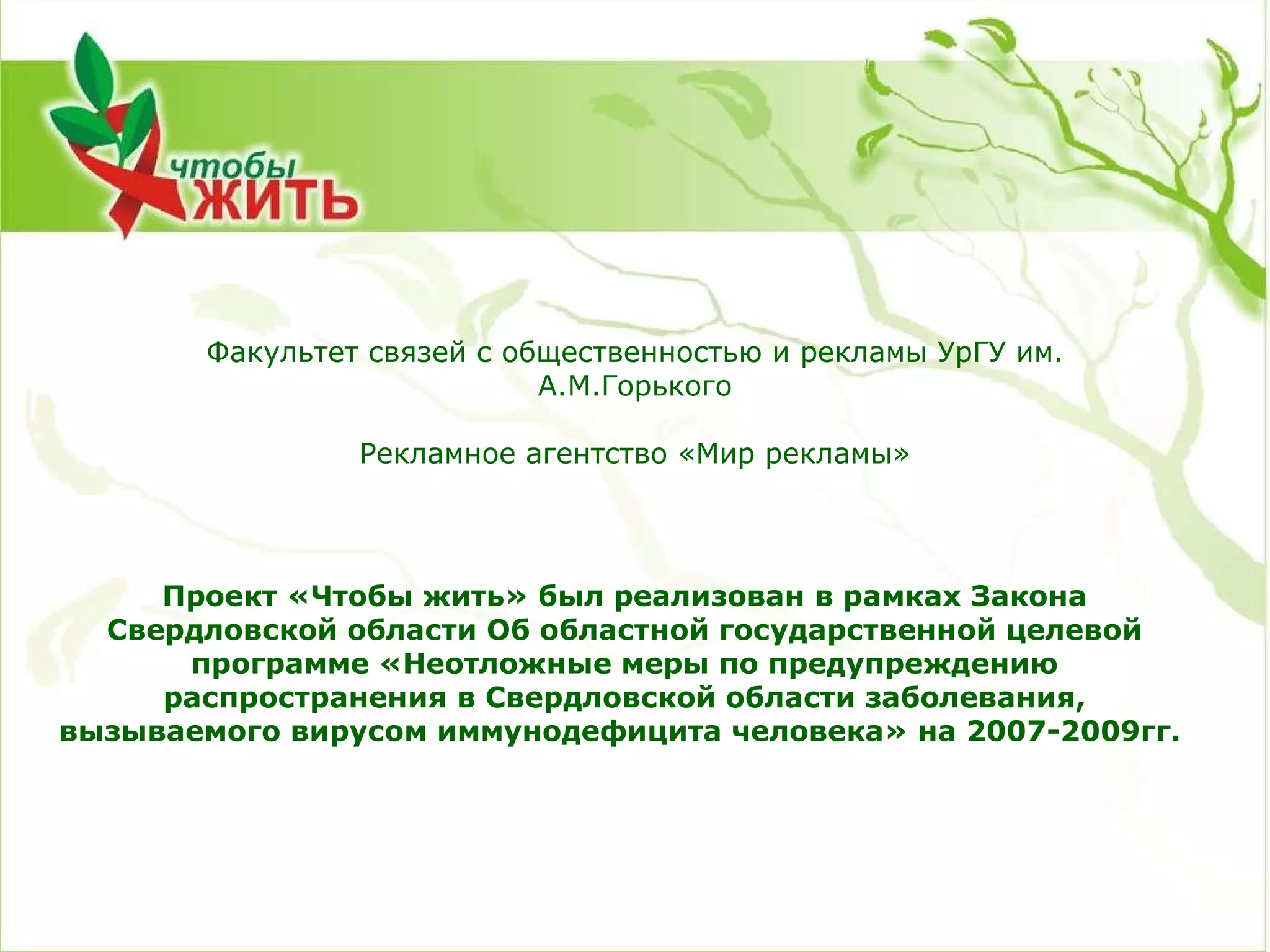 Проект «Чтобы жить», реализованный в Свердловской области с 2007 по 2009 год, направлен на профилактику ВИЧ и пропаганду здорового образа жизни среди молодежи. В рамках проекта проведены спортивные и культурные мероприятия, семинары и тренинги, охватившие более 14 500 молодых людей, а также информирование о способах передачи ВИЧ. Бюджет проекта составил 6 миллионов рублей, и его цели включали повышение осведомленности о ВИЧ/СПИД и привлечение внимания общественности к этой проблеме.