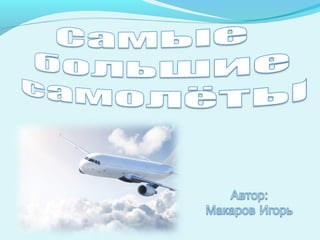 Документ описывает крупнейшие самолеты в мире, включая Ан-225, A380 и Lockheed C-5 Galaxy. Ан-225, созданный на Киевском механическом заводе, является самым большим самолетом с размахом крыльев 88,4 метра и максимальным взлетным весом 640 тонн. Другие самолеты, такие как Hughes H-4 Hercules и Airbus A380, также упоминаются с их характеристиками и историей.
