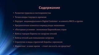 Документ анализирует опыт европейских отелей в преодолении кризисов, описывая методы и стратегии повышения загрузки. Освещаются предпочтения современных клиентов, персонифицированный подход и применение новых технологий, а также случаи успешных акций и маркетинговых мероприятий отелей. Основное внимание уделяется важности адаптации к экономическим условиям и необходимости разработок эффективных маркетинговых стратегий.
