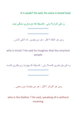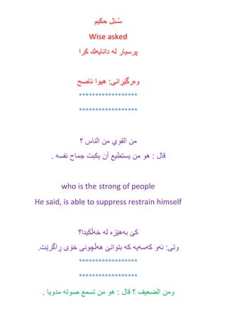 The wise advisor was asked a series of questions about who is considered strong, weak, trivial, etc. For each question, he provided a response defining that trait. He said the strong person is one who can restrain themselves, the weak person is one whose voice is heard loudly, the trivial person thinks they are smarter than others. For other traits like eloquent, scientist, generous, and sincere, he provided short definitions. For the last question about who is complete, he said only God alone is complete.