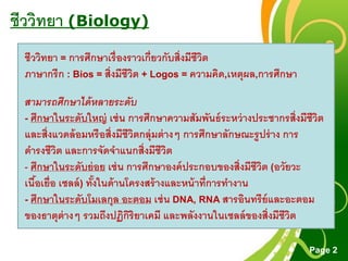 2 ชีววิทยา (Biology) ชีววิทยา = การศึกษาเรื่องราวเกี่ยวกับสิ่งมีชีวิต ภาษากรีก : Bios = สิ่งมีชีวิต + Logos = ความคิด,เหตุผล,การศึกษา สามารถศึกษาได้หลายระดับ - ศึกษาในระดับใหญ่ เช่น การศึกษาความสัมพันธ์ระหว่างประชากรสิ่งมีชีวิต และสิ่งแวดล้อมหรือสิ่งมีชีวิตกลุ่มต่างๆ การศึกษาลักษณะรูปร่าง การ ดารงชีวิต และการจัดจาแนกสิ่งมีชีวิต - ศึกษาในระดับย่อย เช่น การศึกษาองค์ประกอบของสิ่งมีชีวิต (อวัยวะ เนื้อเยื่อ เซลล์) ทั้งในด้านโครงสร้างและหน้าที่การทางาน - ศึกษาในระดับโมเลกุล อะตอม เช่น DNA, RNA สารอินทรีย์และอะตอม ของธาตุต่างๆ รวมถึงปฏิกิริยาเคมี และพลังงานในเซลล์ของสิ่งมีชีวิต