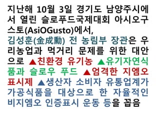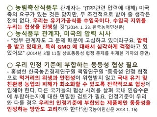 FTA와 TPP가 우리 실생활에 피부에 와닿게 어떤 영향을 미치는지 농촌사회과 먹거리 안전(먹을 권리)을 중심으로 분석하고 설명했습니다. 참고로 미국의 역대 대통령, 그리고 유럽의 일부 지도자들이 언급해 온 News World Oreder(새누리질서)는 정치 사회 경제의 국경 철폐, 그리고 종교의 단일화를 추구합니다. 또한 신자유주의를 지향합니다. 자원부족의 대안으로 인구감축을 말하기도 합니다.