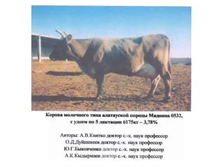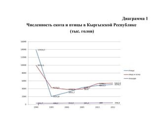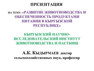 Документ представляет собой презентацию, посвященную развитию животноводства и обеспеченности продуктами питания в Кыргызской Республике, содержащую статистику о численности скота, производстве мяса, молока, яиц и нормам питания населения. Включены данные о видах скота и продуктах животноводства, а также сравнение с показателями других стран. Презентация также описывает достижения в селекции и породоведении в постсоветский период.