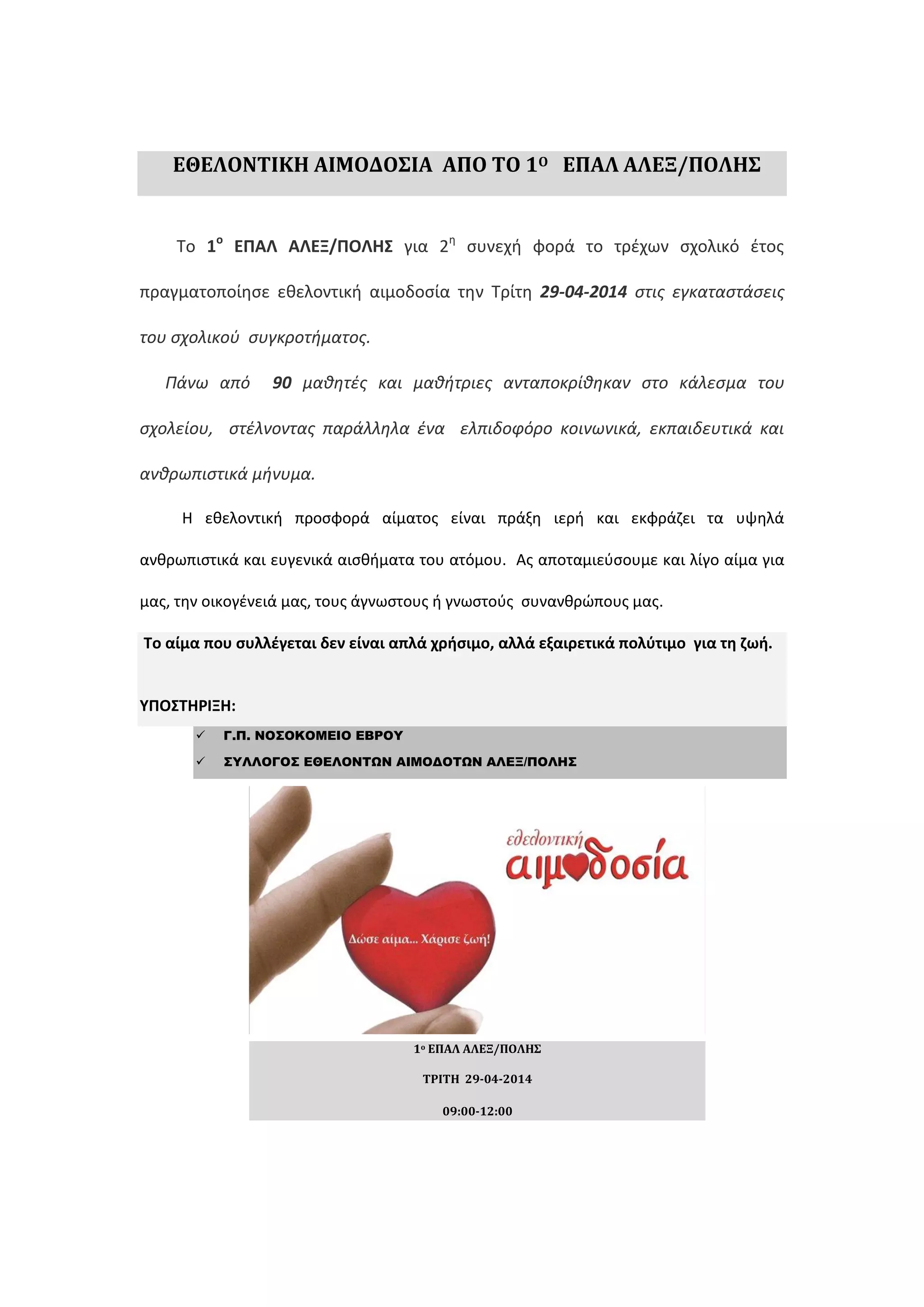 ΕΘΕΛΟΝΤΙΚΗ ΑΙΜΟΔΟΣΙΑ ΑΠΟΤΟ 1Ο ΕΠΑΛ ΑΛΕΞ/ΠΟΛΗΣ