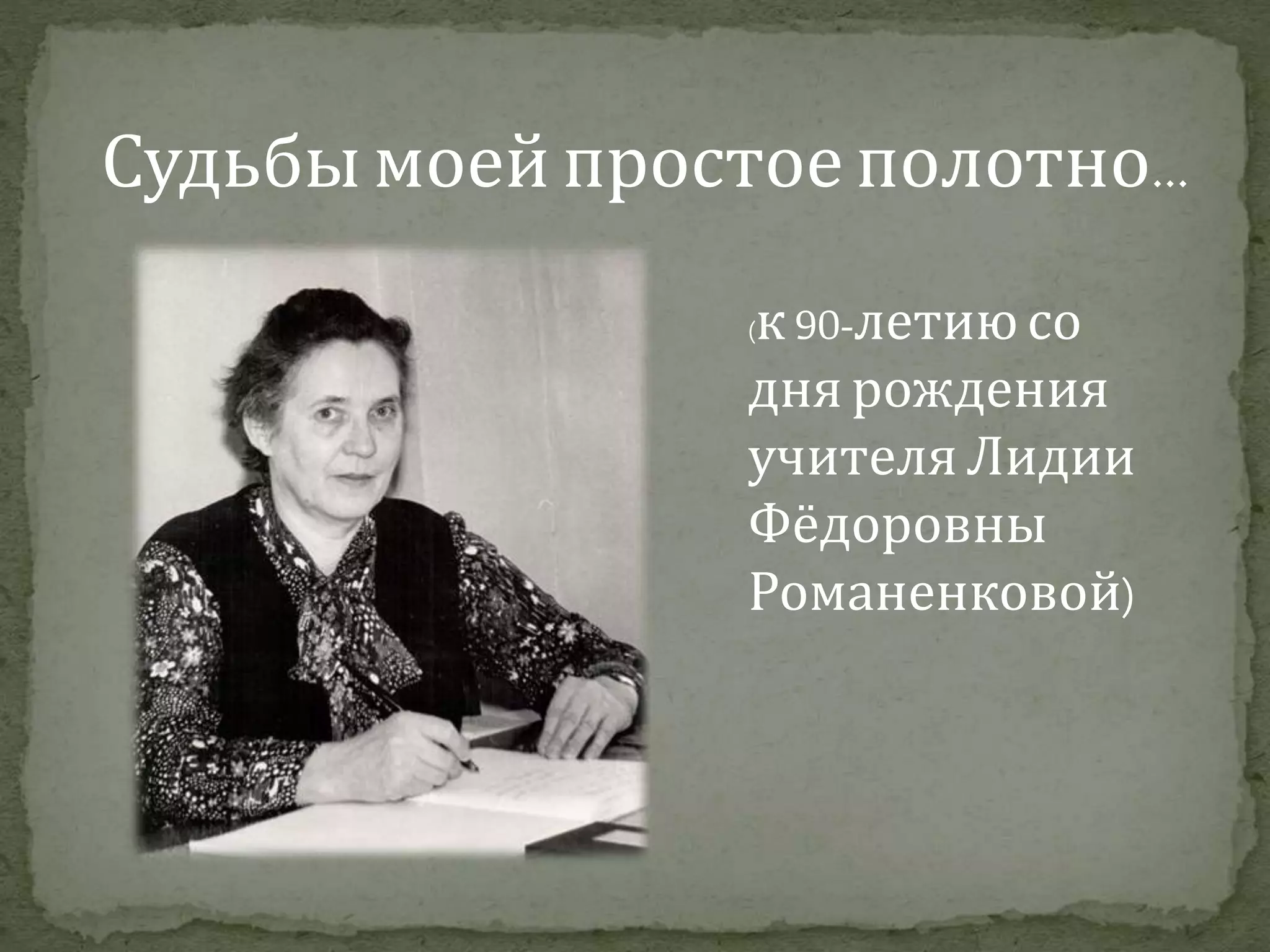 Документ посвящен 90-летнему юбилею учителя Лидии Фёдоровны Романенковой, её жизни и деятельности. Он содержит воспоминания о её семье, учениках и коллегах, а также о её роли в образовательной системе, включая работу в блокадной школе. Содержание подкреплено фотографиями и информацией о юбилее, подготовленной сотрудниками музея педагогической памяти.