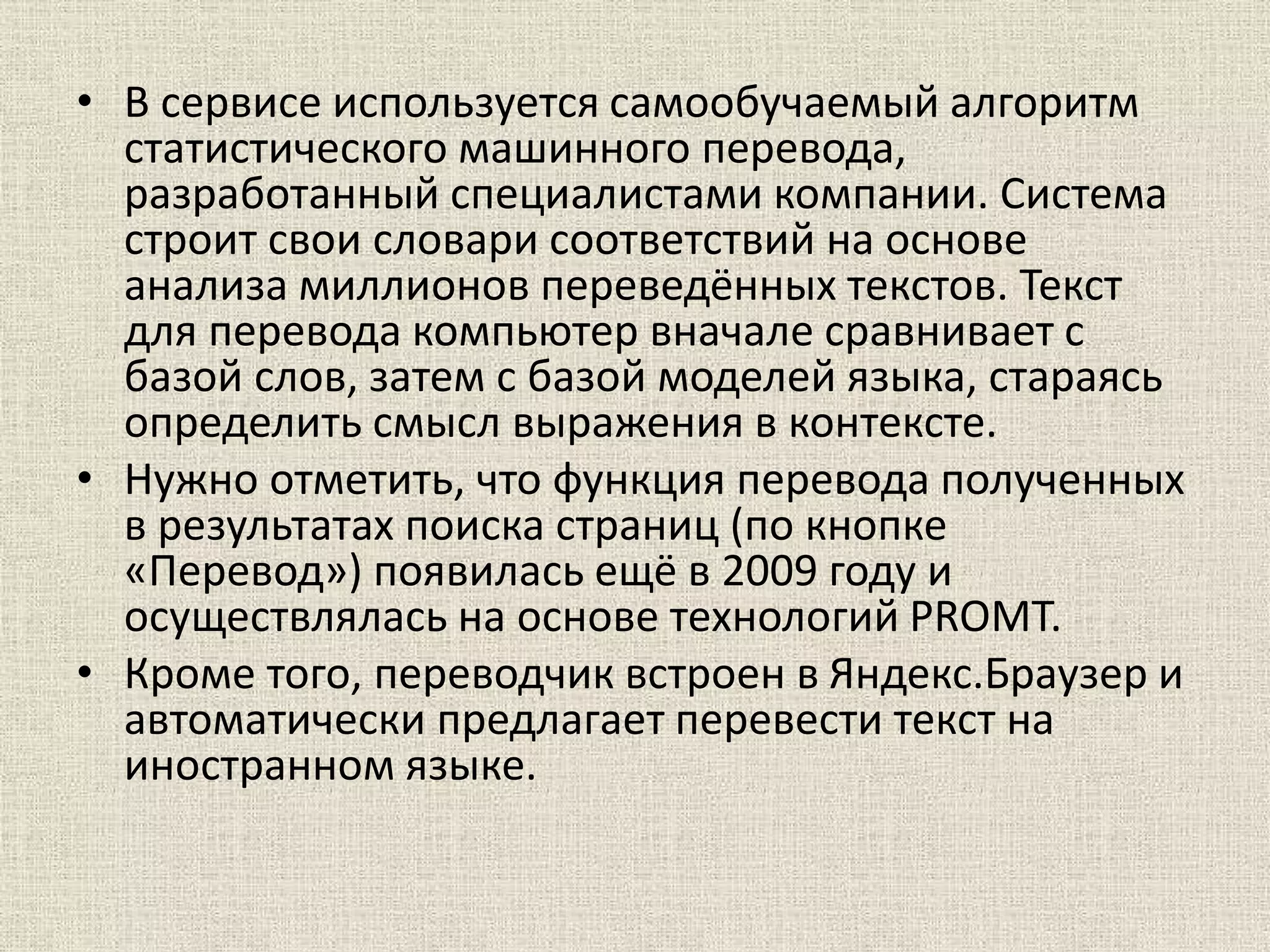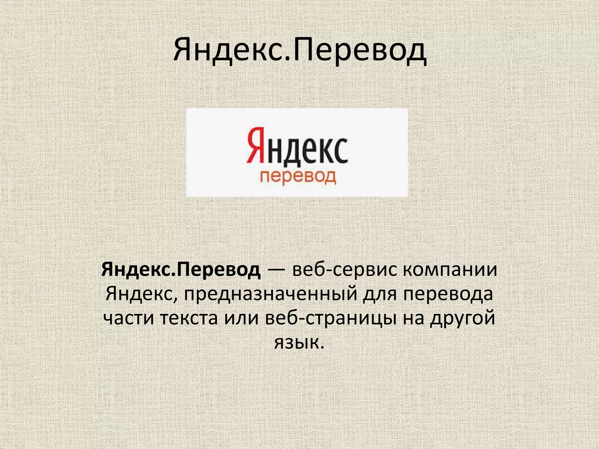 Яндекс.Перевод — это веб-сервис для перевода текста и веб-страниц, использующий самообучающийся алгоритм статистического машинного перевода. Сервис поддерживает 42 языка, предоставляет возможность двухоконного просмотра и доступ к словарям, а также имеет ограничения на точность перевода. Яндекс.Перевод был запущен в 2011 году и продолжает развиваться с новыми функциями и языками.