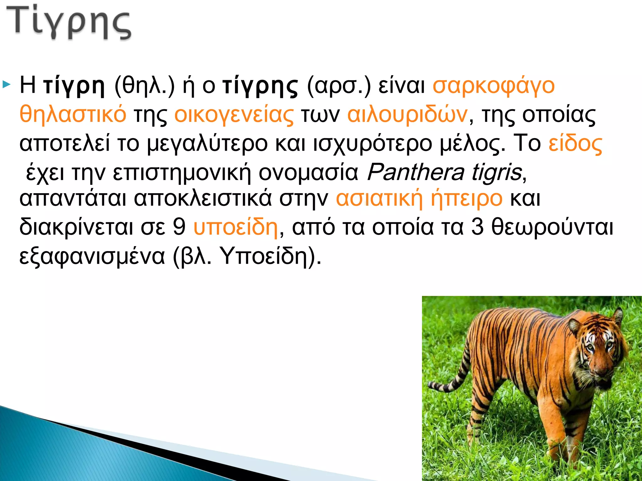 Η τίγρη (θηλ.) ήο τίγρης (αρσ.) είναι σαρκοφάγο