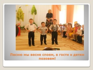 Документ описывает весеннее развлечение в старшей группе детского сада, которое включает стихотворения и песни о весне. Упоминаются персонажи, такие как колобок, и элементы танцевальной программы. Основная тема мероприятия - радостное встречание весны с музыкой и танцами.