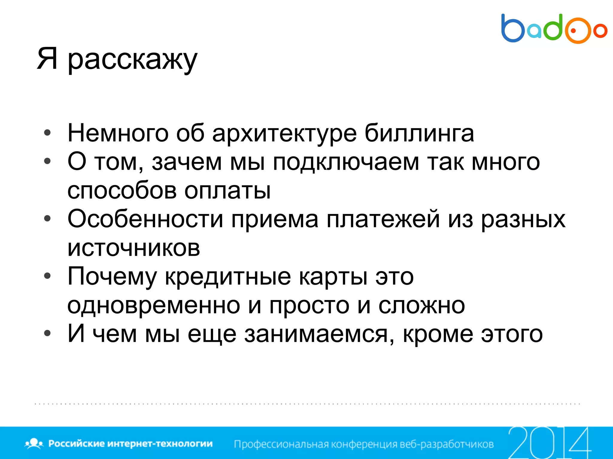 Документ обсуждает архитектуру и особенности системы биллинга в компании Badoo, акцентируя внимание на важности поддержки различных способов оплаты и интеграции с платежными шлюзами. В нем также рассматриваются проблемы безопасности, связанные с фродом и стандартами PCI DSS, а также необходимость тщательного мониторинга и логирования для обеспечения успешных транзакций. Основной вывод заключается в том, что биллинг для больших проектов должен быть адаптивным и учитывать разнообразие рисков.