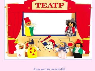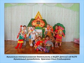 Документ описывает музыкально-театрализованную деятельность в детском саду, сосредотачиваясь на важности театра для развития детей различных возрастных групп. Основные задачи включают совершенствование артистических навыков, развитие социальных умений, координации и культуры речи через игровые формы театра. Также рассматривается организация театрализованных уголков и вовлечение родителей в театральные представления.