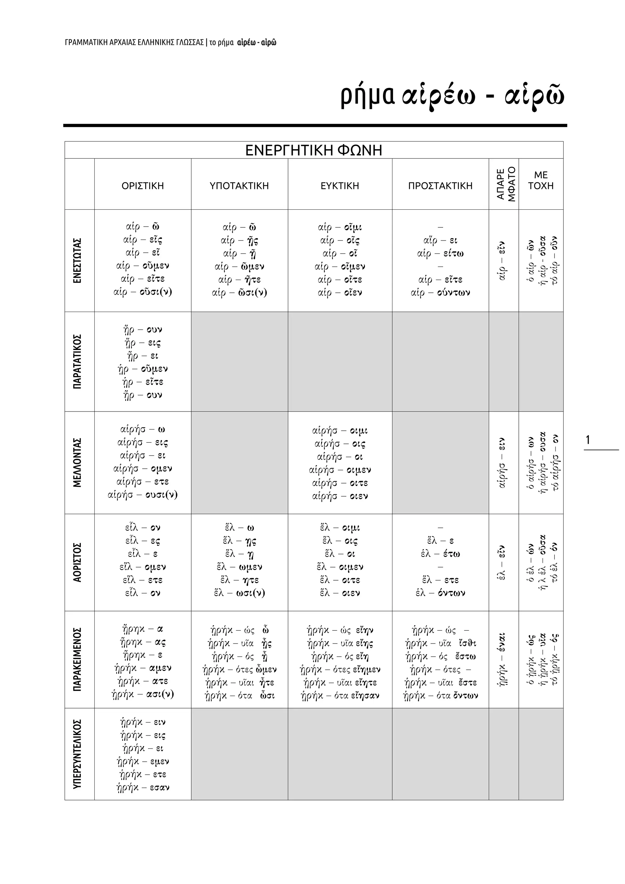 ΓΛΩΣΣΑΣ | το ρήμα αἱρέω - αἱρῶ 1 ρήμα ΕΝΕΡΓΗΤΙΚΗ ΦΩΝΗ ΟΡΙΣΤΙΚΗ ΥΠΟΤΑΚΤΙΚΗ ΕΥΚΤΙΚΗ ΠΡΟΣΤΑΚΤΙΚΗ ΑΠΑΡΕ ΜΦΑΤΟ ΦΑΤΟ ΜΕ ΤΟΧΗ ΕΝΕΣΤΩΤΑΣΠΑΡΑΤΑΤΙΚΟΣΜΕΛΛΟΝΤΑΣΑΟΡΙΣΤΟΣΠΑΡΑΚΕΙΜΕΝΟΣΥΠΕΡΣΥΝΤΕΛΙΚΟΣ