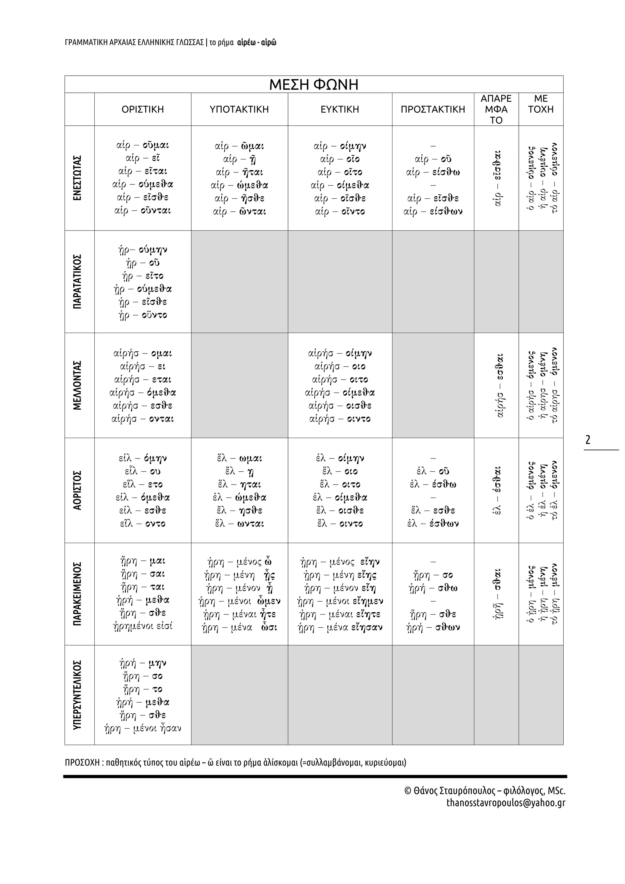 ΓΛΩΣΣΑΣ | το ρήμα αἱρέω - αἱρῶ 2 ΜΕΣΗ ΦΩΝΗ ΟΡΙΣΤΙΚΗ ΥΠΟΤΑΚΤΙΚΗ ΕΥΚΤΙΚΗ ΠΡΟΣΤΑΚΤΙΚΗ ΑΠΑΡΕ ΜΦΑ ΤΟ ΜΕ ΤΟΧΗ ΕΝΕΣΤΩΤΑΣΠΑΡΑΤΑΤΙΚΟΣΜΕΛΛΟΝΤΑΣΑΟΡΙΣΤΟΣΠΑΡΑΚΕΙΜΕΝΟΣΥΠΕΡΣΥΝΤΕΛΙΚΟΣ ΠΡΟΣΟΧΗ : παθητικός τύπος του αἱρέω – ῶ είναι το ρήμα ἁλίσκομαι (=συλλαμβάνομαι, κυριεύομαι) © Θάνος Σταυρόπουλος – φιλόλογος, MSc. thanosstavropoulos@yahoo.gr
