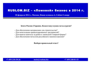 Доклад, проведённый О. Масленниковым, охватывает стратегии ценообразования в металлургическом бизнесе России на 2014 год. Он обсуждает важность металлургии для экономики, тенденции экспорта полуфабрикатов и факторы, способствующие успеху в условиях кризиса. Примеры и статистические данные подчеркивают необходимость оптимизации процессов и снижения затрат на сырьё.