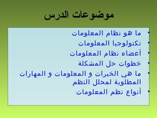 تتناول الوثيقة موضوع نظم المعلومات وتصميمها، حيث تشرح الفرق بين المعلومات والبيانات وأنواع نظم المعلومات المختلفة مثل نظم معالجة المعاملات وأنظمة الإدارة. كما تتحدث عن خطوات حل المشكلات ومتطلبات تحليل وتصميم نظم المعلومات. وتُبرز الوثيقة أهمية المهارات والخبرات المطلوبة لمحلل نظم المعلومات.