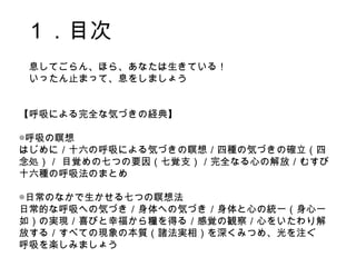 1.目次 息してごらん、ほら、あなたは生きている! いったん止まって、息をしましょう 【呼吸による完全な気づきの経典】 ◎呼吸の瞑想 はじめに/十六の呼吸による気づきの瞑想/四種の気づきの確立(四 念処)/ 目覚めの七つの要因(七覚支)/完全なる心の解放/むすび 十六種の呼吸法のまとめ ◎日常のなかで生かせる七つの瞑想法 日常的な呼吸への気づき/身体への気づき/身体と心の統一(身心一 如)の実現/喜びと幸福から糧を得る/感覚の観察/心をいたわり解 放する/すべての現象の本質(諸法実相)を深くみつめ、光を注ぐ 呼吸を楽しみましょう