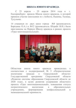 С 23 по 25 апреля 2014 года в Екатеринбурге прошла школа юного краеведа, в которой участвовали 14 школьников из двух образовательных учреждений, целью которой было развитие патриотического воспитания и культурной терпимости. Участники посетили экскурсии, мастер-классы и приняли участие в молодежном фестивале культур, а также получили грамоты и памятные подарки. Школа организована в рамках областного проекта «Урал многонациональный» и подпрограммы по патриотическому воспитанию.