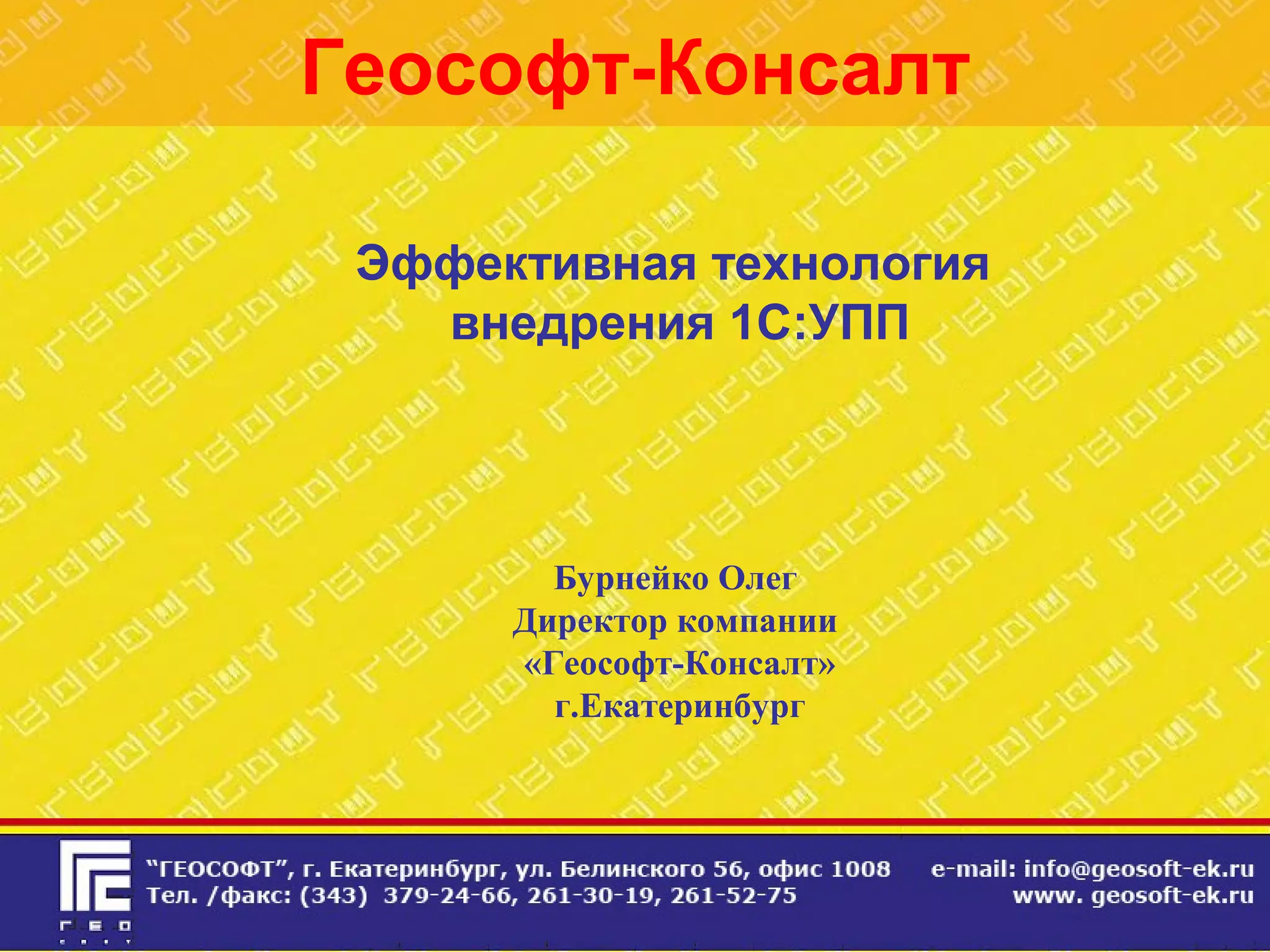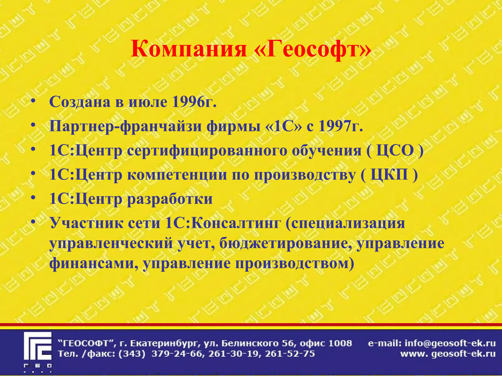 Компания «Геософт-консалт», основанная в 1996 году, является партнером фирмы «1С» и предоставляет услуги по внедрению программного обеспечения для управленческого, бухгалтерского учета и финансового планирования. Используя технологии контрольных примеров, компания успешно автоматизирует процессы для малых и крупных предприятий, сокращая сроки и бюджеты проектов. Основные направления включают управление производственными предприятиями, торговлей и расчетами с персоналом, с возможностью индивидуальных доработок под нужды клиентов.