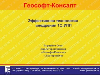 Документ описывает компанию «Геософт-консалт», специализирующуюся на внедрении программного обеспечения 1С для управленческого учета, бюджетирования и производства. Упрощенные технологии внедрения, такие как контрольные примеры, позволяют сократить сроки и бюджет проектов, что делает их эффективными для различных типов бизнеса. В документе также приведены примеры успешных проектов и информация о сотрудничестве с партнерами.