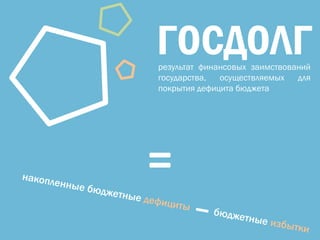 Документ анализирует госдолг США и России, предлагая данные о внешнем и внутреннем долге обеих стран в разные годы, а также их отношение к ВВП. В 2013 году государственный долг США составил 17,453 трлн долларов, а долг России в процентном соотношении к ВВП был значительно ниже. Также упоминаются особенности задолженности России перед международными финансовыми организациями и ее структуры на конец 2013 года.