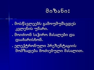 მიზანი: . მოსწავლეებსგამოუმუშავდეს კვლენის უნარი. . მოიძიონ საჭირო მასალები და დაახარისხონ. . ელექტრონული პრეზენტაციის მომზადება მოძიებული მასალით.